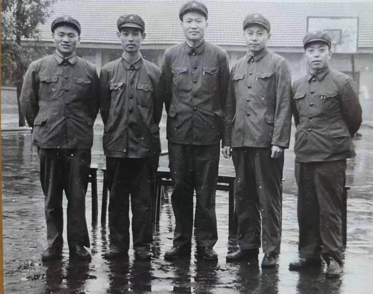 本文作者(左二)與一同採訪洪湖赤衛隊劉闖劉隊長原型人物一一成都軍區後勤部周樹槐副部長的新聞幹事趙光文(右一)等戰友在一起合影留念。