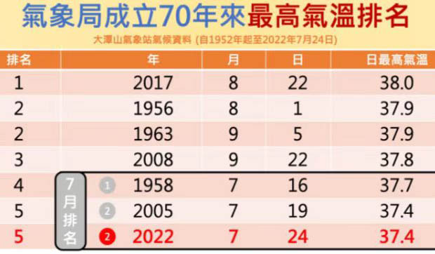 本報訊(記者木蘭)本澳酷熱天氣持續多日,氣象局表示,今日(24日)正午時分,大潭山氣象站錄得最高氣溫攝氏37.4度,是自1952年氣象局成立以來單日最高氣溫排行的第五位,同時錄得70年來7月份第二高溫。