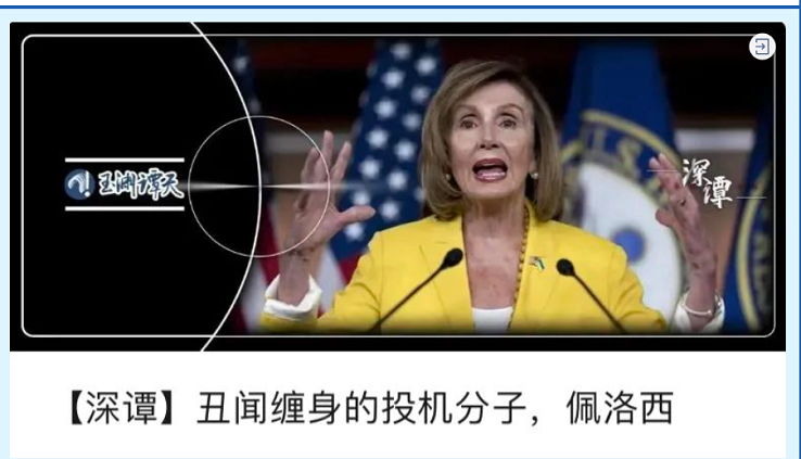 8月3日,玉淵譚天微信公眾號首發報導《【深譚】醜聞纏身的投機分子,佩洛西》,閱讀量迅速突破10萬加,全網置頂。以故事化的敘述和歷史縱深的視角,揭露最近“煩心事很多”的佩洛西,靠打“臺灣牌”為自己謀取政治地位的動機。