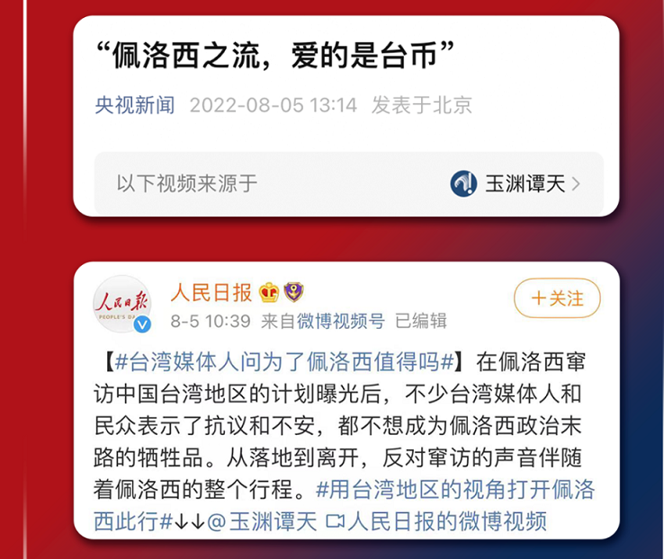 全球“廣泛發”!針對佩洛西竄台行動,玉淵譚天在各關鍵節點,適時適度梯度精准釋放中方行動資訊,先後播發了20餘個重磅拳頭產品,多個產品被全球主要媒體轉載,成為輿論反制的前哨站和特種兵。