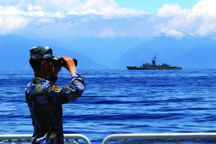 東部戰區海軍10餘艘驅護艦艇連續位台島周邊海域實施聯合封控行動,對火力試射區域進行掃海警戒,配合友鄰兵力進行偵察引導。官兵全程保持高度戒備,多次拉動,進行對海打擊、防空反導、聯合反潛等訓練,隨時準備應對可能的突發情況。