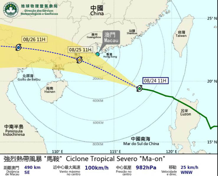 在 11 時強烈熱帶風暴 “馬鞍” (2209) 集結在本澳東南約490公里,大致趨向珠江口以西。 “馬鞍”今晚至明日最接近珠江口一帶,屆時會對本澳造成較顯著的影響,今晚開始本澳天氣轉趨不穩定,未來 2天本澳風勢將顯著增強,驟雨漸趨頻密及有雷暴。由於未來數日正值天文潮高位,疊加風暴潮及持續降雨影響下,預料明日淩晨至早上低窪地區有顯著水浸,呼籲巿民儘早做好防風及防水浸措施。