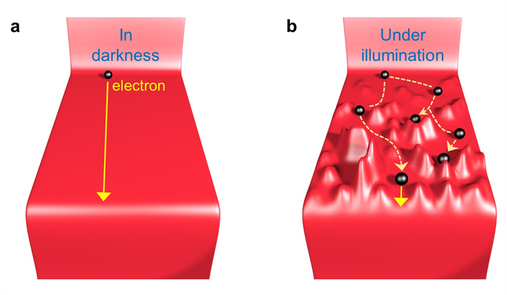 兩校的研究團隊進行研究並首次揭示了混合二維/三維鈣鈦礦體系中獨特的光致載流子阻塞效應。研究發現,在黑暗條件下,二維鈣鈦礦組分不會阻礙載流子的傳輸;而在光照條件下,二維/三維鈣鈦礦介面的內建電場會增強,結合其鑲嵌式的相分佈規律,導致光生電子的傳輸被光致勢壘阻礙,而光生空穴則被光生陷阱俘獲。這一機制很好地解釋了混合二維/三維鈣鈦礦太陽能電池短路電流和填充因數低的現象。這一機制的提出,為優化混合二維/三維鈣鈦礦太陽能電池的性能提供了新的理論指導。