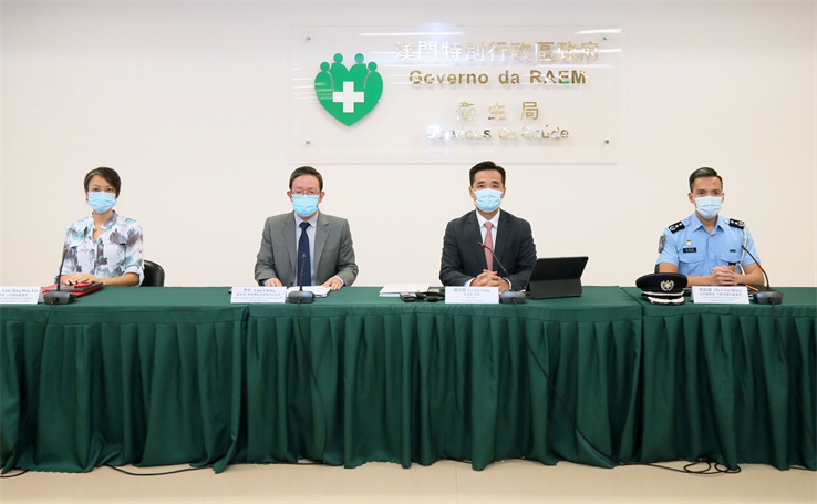 應變協調中心11月11日傍晩六時臨時舉行疫情新聞發布會,公布調整防疫措施。衛生局長羅奕龍、疾病預防及控制中心主任林松,旅遊局公共關系處長藍同好及治安警行動及通訊處長馬超雄出席。