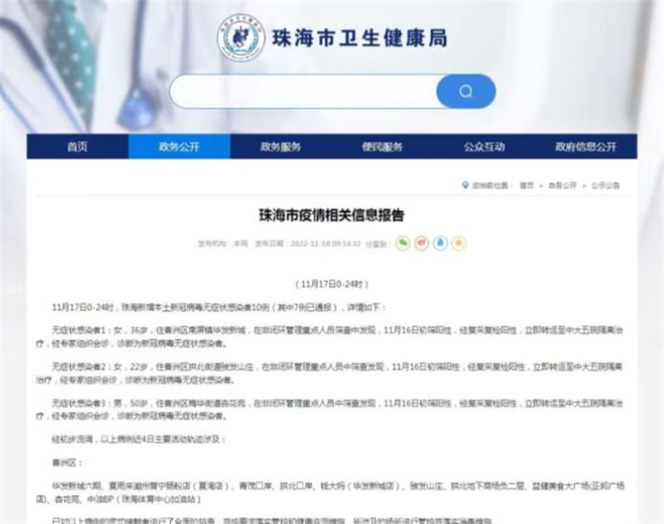 本網訊(記者桂英)珠海市疫情相關資訊報告:11月17日0-24時,珠海新增本土新冠病毒無症狀感染者10例(其中7例已通報),詳情如下: