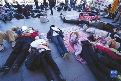 當日,300多名民衆聚集在會展中心門前,高喊“拒絕爲戰争準備”“拒絕死亡商人”“反對戰争”等口号強烈抗議日本強化武器交易。抗議演講之後,民衆還集體倒地,以行爲語言以示抗議。