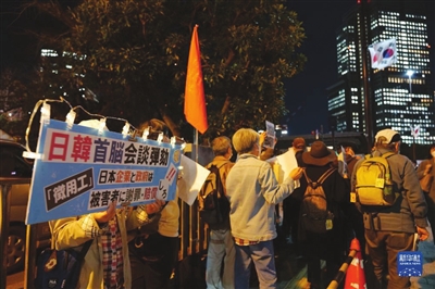當天,日本不少民衆在首相官邸外抗議日韓政府漠視受害者當事人,呼籲日本企業和政府向強征勞工謝罪并賠償,同時強烈反對美日韓強化軍事同盟。