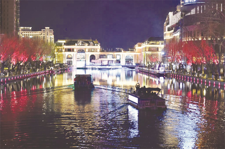 在亮馬河畔,遊人如織,遊船在夜色下緩緩駛過。今年開航後,遊船航線達6公里,沿線途經燕莎碼頭、藍色港灣、三裏屯等多個商圈,航線中包含多處光影、演藝等文化觀賞專案,平均10分鐘就有一班遊船啟動,成為近期北京文旅消費的新亮點。