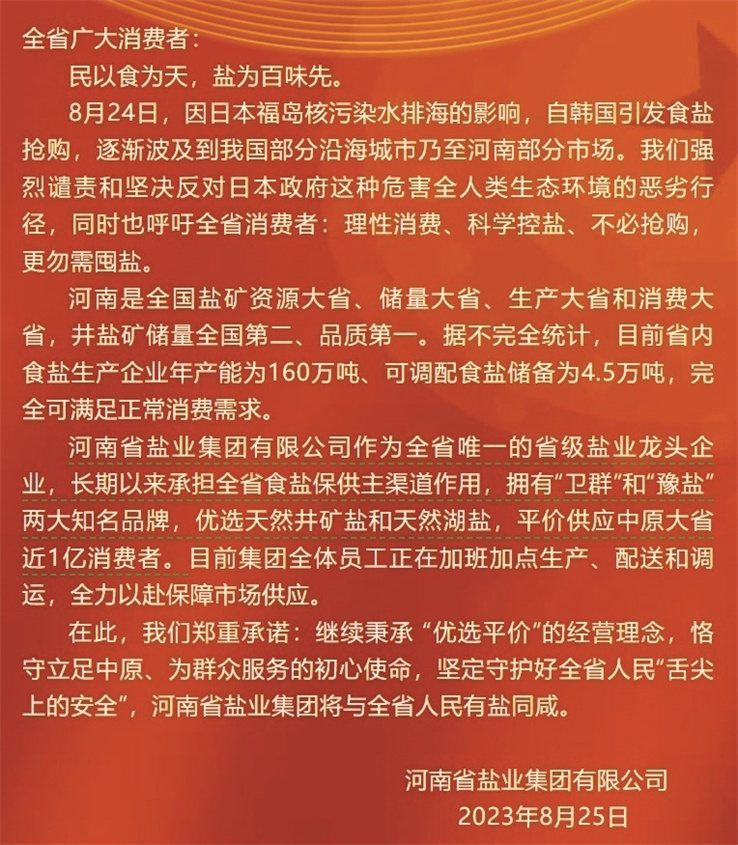 25日,河南鹽業集團發佈致全省食鹽消費者的一封信:河南是全國鹽礦資源大省、儲量大省、生產大省和消費大省,井鹽礦儲量全國第二、品質第一。據不完全統計,目前河南省內食鹽生產企業年產能為160萬噸、可調配食鹽儲備為4.5萬噸,完全可滿足正常消費需求。目前集團全體員工正在加班加點生產、配送和調運,全力以赴保障市場供應。