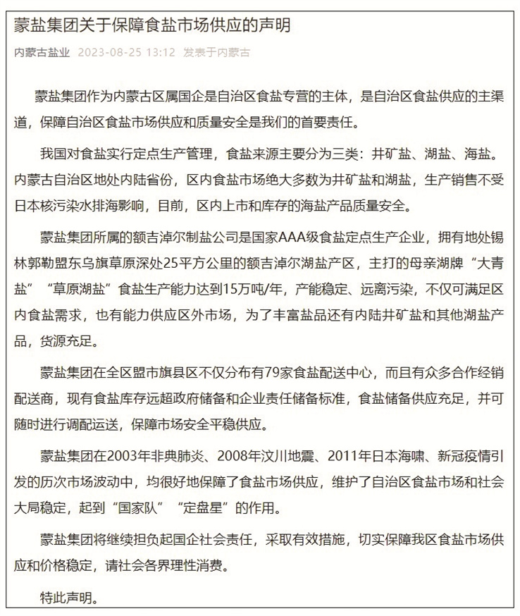 25日,蒙鹽集團發佈關於保障食鹽市場供應的聲明:內蒙古自治區地處內陸省份,區內食鹽市場絕大多數為井礦鹽和湖鹽,生產銷售不受日本核污染水排海影響,目前,區內上市和庫存的海鹽產品品質安全。蒙鹽集團所屬的額吉淖爾制鹽公司是國家AAA級食鹽定點生產企業,擁有地處錫林郭勒盟東烏旗草原深處25平方公里的額吉淖爾湖鹽產區,主打的母親湖牌“大青鹽”“草原湖鹽”食鹽生產能力達到15萬噸/年,產能穩定、遠離污染,不僅可滿足區內食鹽需求,也有能力供應區外市場,為了豐富鹽品還有內陸井礦鹽和其他湖鹽產品,貨源充足。蒙鹽集團在全區盟市旗縣區不僅分佈有79家食鹽配送中心,而且有眾多合作經銷配送商,現有食鹽庫存遠超政府儲備和企業責任儲備標準,食鹽儲備供應充足,並可隨時進行調配運送,保障市場安全平穩供應。