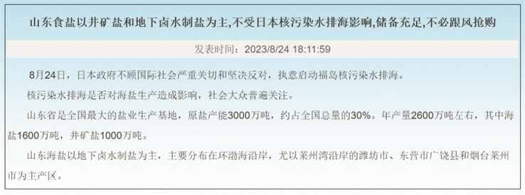 24日,山東省鹽業協會發佈聲明稱,山東食鹽以井礦鹽和地下鹵水制鹽為主,不受日本核污染水排海影響,儲備充足,不必跟風搶購。山東省是全國最大的鹽業生產基地,原鹽產能3000萬噸,約占全國總量的30%。年產量2600萬噸左右,其中海鹽1600萬噸,井礦鹽1000萬噸。山東省所產食鹽以井礦鹽和地下鹵水制鹽為主,不受日本核污染水排海影響。全省省、市、縣三級食鹽政府儲備和11家食鹽(多品種食鹽)定點生產企業、125家食鹽定點批發企業社會責任儲備合計超過17萬噸,可以滿足全省半年多的正常銷量,廣大消費者不必跟風搶購囤鹽。