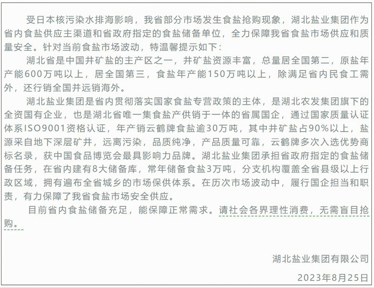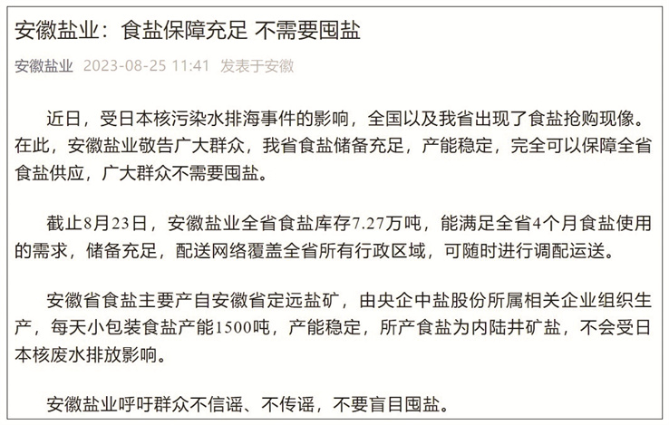 25日,安徽鹽業集團發文表示,安徽省食鹽儲備充足,產能穩定,完全可以保障全省食鹽供應,廣大群眾不需要囤鹽。截至8月23日,安徽鹽業全省食鹽庫存7.27萬噸,能滿足全省4個月食鹽使用的需求,儲備充足,配送網路覆蓋全省所有行政區域,可隨時進行調配運送。安徽省食鹽主要產自安徽省定遠鹽礦,由央企中鹽股份所屬相關企業組織生產,每天小包裝食鹽產能1500噸,產能穩定,所產食鹽為內陸井礦鹽,不會受日本核廢水排放影響。