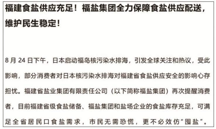 近日,受日本核污染水排海影響,部分市場出現搶鹽、囤鹽現象。對此,中國鹽業集團、川鹽集團、福鹽集團、江鹽集團、安徽鹽業集團等多地鹽業公司發文稱,食鹽儲備供應充足,呼籲社會各界理性消費,不要盲目搶購。