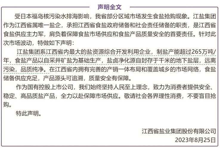 江鹽集團25日發佈聲明稱,江鹽集團系江西省內最大的鹽資源綜合開發利用企業,制鹽產能超過265萬噸/年,食鹽產品以自采井礦鹽為基礎生產,鹽鹵淨化源自封存於千米的地下鹽層,遠離污染,品質純淨。在江西省內擁有完善的產銷一體佈局和覆蓋城鄉的市場網路,食鹽儲備供應充足,產品源頭可追溯,品質安全有保障。公司將致力為消費者提供安全、穩定、高品質鹽產品,全力以赴保障市場供應。敬請社會各界理性消費,不要盲目搶購。