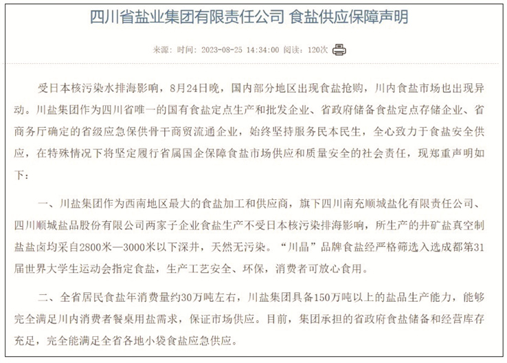 25日,四川省鹽業集團有限責任公司發佈食鹽供應保障聲明:川鹽集團作為西南地區最大的食鹽加工和供應商,旗下四川南充順城鹽化有限責任公司、四川順城鹽品股份有限公司兩家子企業食鹽生產不受日本核污染排海影響,所生產的井礦鹽真空制鹽鹽鹵均采自2800米—3000米以下深井,天然無污染。四川全省居民食鹽年消費量約30萬噸左右,川鹽集團具備150萬噸以上的鹽品生產能力,能夠完全滿足川內消費者餐桌用鹽需求,保證市場供應。