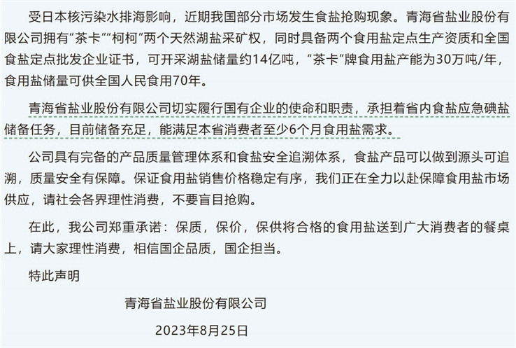 8月25日,青海省鹽業股份有限公司發佈聲明稱,該公司擁有“茶卡”“柯柯”兩個天然湖鹽採礦權,同時具備兩個食用鹽定點生產資質和全國食鹽定點批發企業證書,可開採湖鹽儲量約14億噸,“茶卡”牌食用鹽產能為30萬噸/年,食用鹽儲量可供全國人民食用70年。
