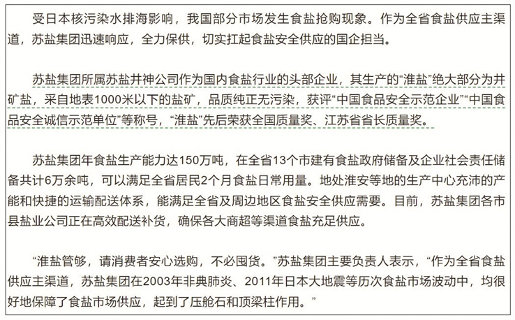 蘇鹽集團24日發佈聲明稱,蘇鹽集團所屬蘇鹽井神公司生產的“淮鹽”絕大部分為井礦鹽,采自地表1000米以下的鹽礦,品質純正無污染。蘇鹽集團年食鹽生產能力達150萬噸,在全省13個市建有食鹽政府儲備及企業社會責任儲備共計6萬餘噸,可以滿足江蘇全省居民2個月食鹽日常用量。地處淮安等地的生產中心充沛的產能和快捷的運輸配送體系,能滿足全省及周邊地區食鹽安全供應需要。目前,蘇鹽集團各市縣鹽業公司正在高效配送補貨,確保各大商超等管道食鹽充足供應。