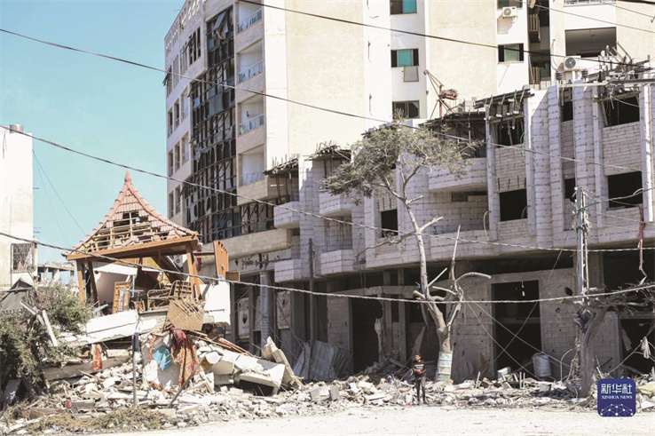 這是10月13日在加沙城拍攝的遭以色列空襲損毀的建築。新華社發(裏澤克·阿蔔杜勒賈瓦德攝)