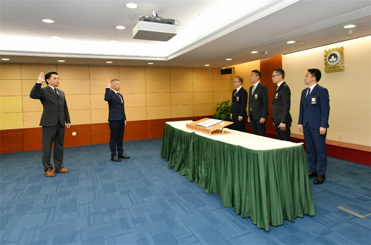 本報訊(記者 大林)司法警察局於近日舉行主管就職儀式,在局長薛仲明監誓,三位副局長賴文威、蘇兆強、岑錦榮及各部門主管的見證下,博彩及經濟罪案調查廳廳長鄧錦華和博彩罪案調查處處長黃志豪分別宣誓就職。