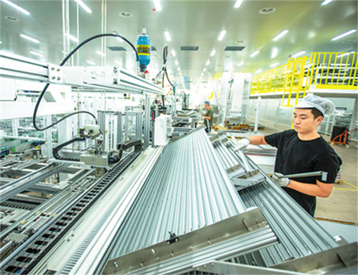 十一月三日,浙江金華金東區江東鎮工業園區潤馬光能集團金華組件廠生產車間內,生產線馬力全開,工人們在趕制太陽能光伏組件外貿訂單產品。