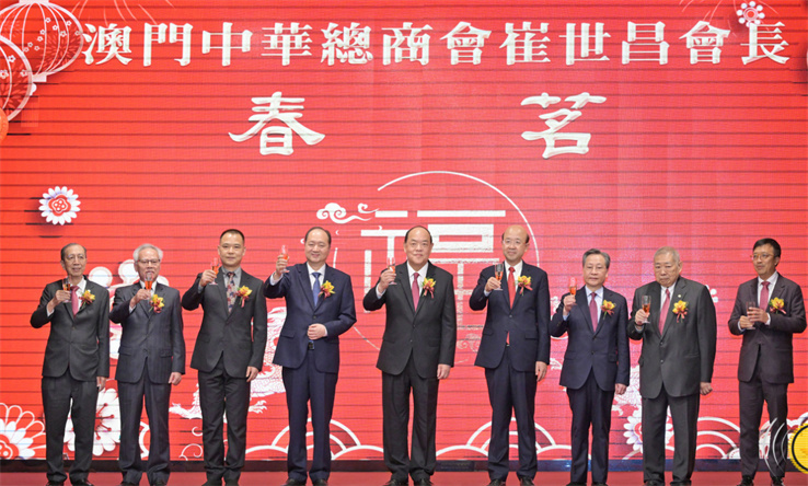 澳門中華總商會19日晚七時三十分假萬豪軒舉行甲辰年春茗。行政長官賀一誠、澳門中聯辦主任鄭新聰、外交部駐澳門特派員公署特派員劉顯法、駐澳門部隊副司令員戴勁松、立法會主席高開賢、終審法院院長岑浩輝等出席。