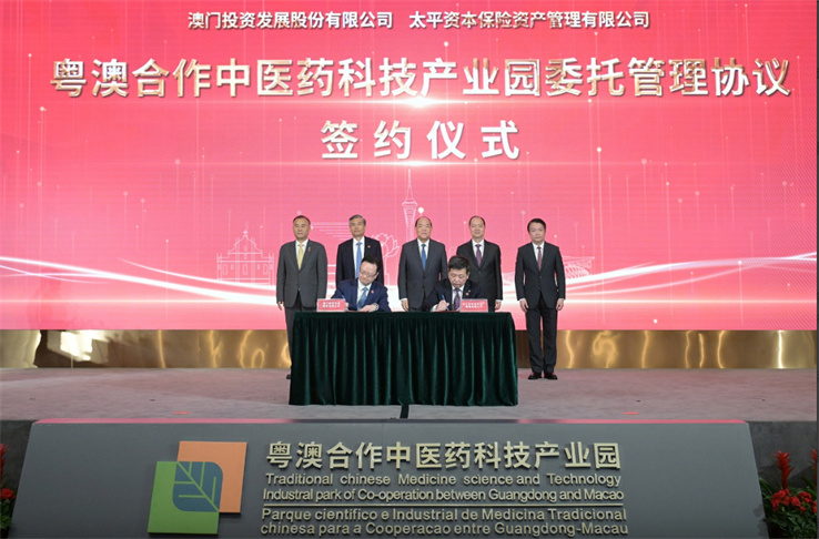 在澳門特別行政區行政長官、橫琴粵澳深度合作區管理委員會主任賀一誠,中央人民政府駐澳門特別行政區聯絡辦公室主任鄭新聰,中國太平保險集團董事長王思東,澳門特別行政區經濟財政司司長、橫琴粵澳深度合作區執行委員會主任李偉農和中國太平保險集團副總經理李可東見證下,由澳門投資發展股份有限公司主席吳建峰與太平資本保險資產管理有限公司總經理吳松代表雙方簽署《粵澳合作中醫藥科技產業園委託管理協議》,正式建立委託管理關係,共同推進產業園提升服務品質,加快產業聚集。