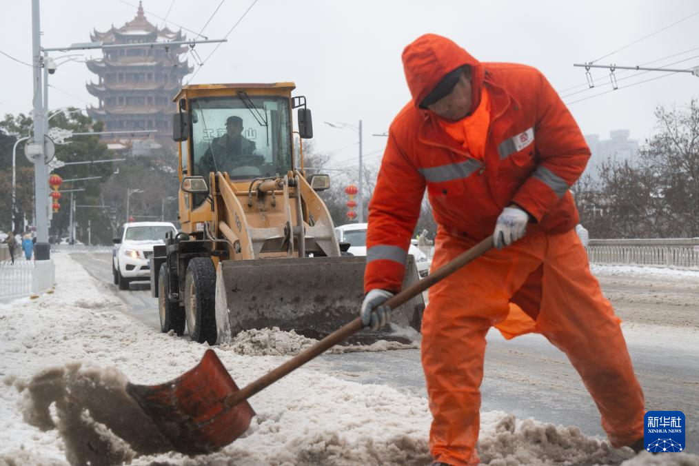 22日中午,長江南岸蛇山之巔,黃鶴樓上白雪皚皚。不遠處的武漢長江大橋上,環衛工人緊張忙碌,掃雪車來回穿行,被鏟開的雪渣飛向路肩,柏油馬路逐漸露出本來顏色。