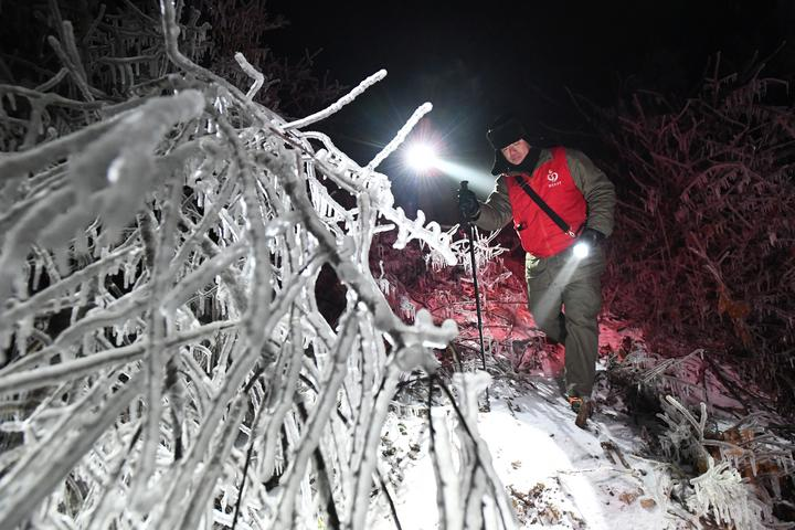 2月21日夜間,在武漢市最北端的清涼寨,黑暗不時被強光手電筒的光束劃破。敲掉鐵塔上的冰層,腰間系掛好安全繩,3名國網武漢供電公司的工作人員開始艱難地向上攀爬。