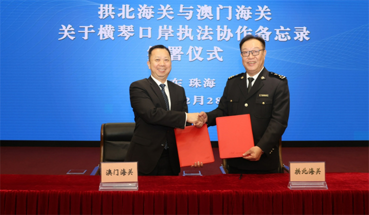 備忘錄簽署儀式於2月28日在拱北海關業務技術綜合樓舉行,由澳門海關關長黃文忠與拱北海關關長詹少彤共同簽署。此次備忘錄的簽署,標誌著“大型集裝箱/車輛檢查設備圖像資訊共用共用”和“口岸貨運核輻射監測”兩項執法協作專案在橫琴口岸正式落地,將有效提升監管效能,提高通關效率,為琴澳兩地高質量發展提供新的助力。