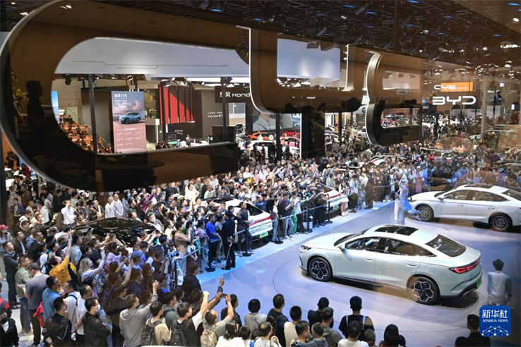 2024年5月4日,2024(第十八屆)北京國際汽車展覽會閉幕,參觀者在2024北京車展比亞迪品牌展臺參觀。新華社記者 尹棟遜 攝