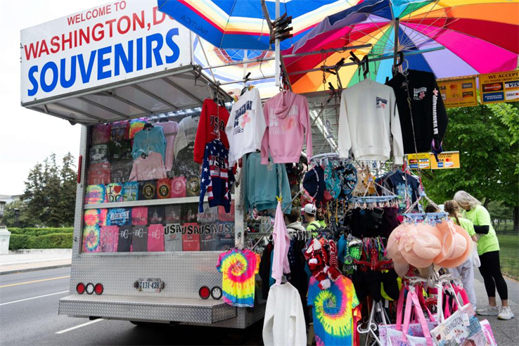 4月25日,在美國首都華盛頓,遊客在一處白宮附近的紀念品攤位前選購商品。新華社記者劉傑攝