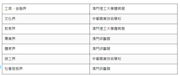 根據選管會發出的告示,澳門理工大學體育館為行政長官選委會委員選舉第一界別工商、金融界,以及第二界別中教育界委員選舉的投票站;中葡職業技術學校為第二界別中文化界和第三界別中勞工界委員選舉的投票站;澳門綜藝館為第二界別中專業界及體育界、第三界別中社會服務界委員選舉的投票站。