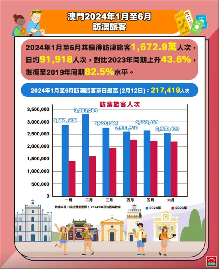 旅遊局相關臨時數據顯示,今年1至6月澳門的入境旅客約1,672.9萬人次,日均近9.2萬(91,918)人次,較2023年同期上升43.6%,並恢復至2019年同期82.5%水準。