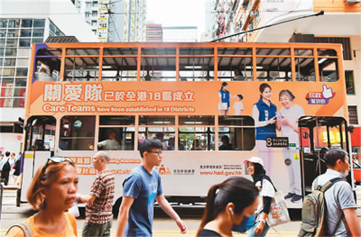 一輛塗裝關愛隊宣傳海報的有軌電車從香港街頭駛過。新華社記者 陳 鐸攝