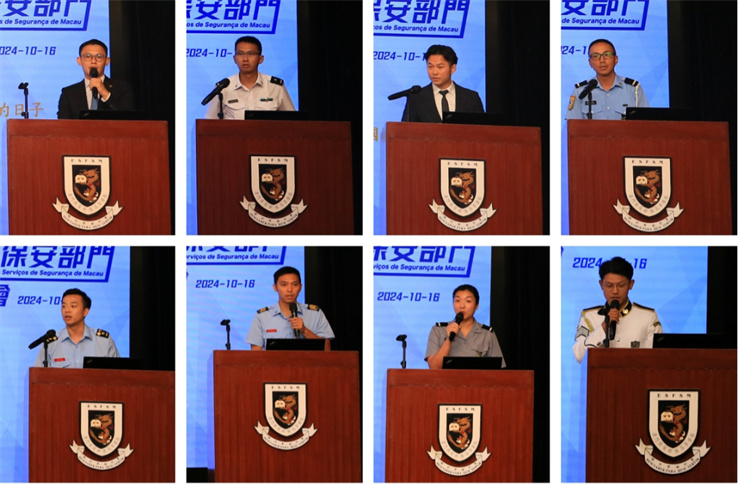 本年分享會共有八位人員作出分享,分別任職於保安部隊及保安部門不同的工作崗位,題目依次為:員警總局首席刑事偵查員崔家強的「行與思─我在大型聯合演練的日子」、澳門海關關務督察林志文的《嚴防走水「守關」門》、司法警察局職務主管周錠軒的「派駐國際刑警組織─勇於挑戰·專業執法·邁向國際」、治安警察局副警長鄭偉強的「遇風,馭風,破風」、澳門保安部隊高等學校副一等消防區長譚健明的「教有所得學有所成」、消防局首席消防員黃崇升的「命懸一線」、懲教管理局副警長淩惠婷的「『懲』心話」,以及治安警察局首席警員何志斌的「音符下的責任」。每一位分享者以親身經歷訴說他們的員警故事,在崗位上如何發揮專業,秉持保安當局提出的三個警務理念:「主動警務」、「社區警務」和「公關警務」。