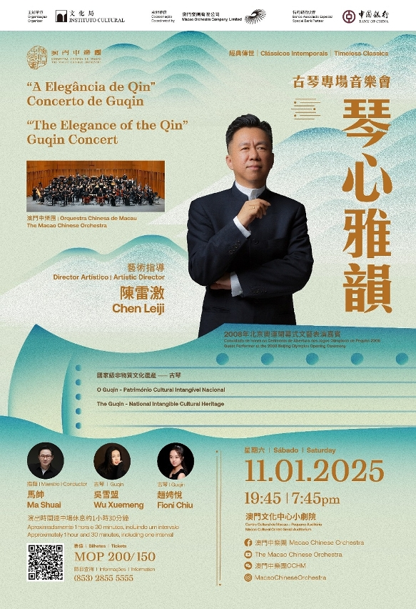 本報訊 (記者 曉陽)由文化局舉辦的澳門中樂團2024-25樂季節目古琴專場音樂會《琴心雅韻》,於1月11日晚上7時45分在澳門文化中心小劇院上演。當代古琴藝術領軍人物陳雷激親臨澳門,擔任藝術指導及古琴演奏,親自獻演多首古琴名曲,更呈獻兩首為本場音樂會全新創作的古琴獨奏及協奏曲,在音樂會中作世界首演。