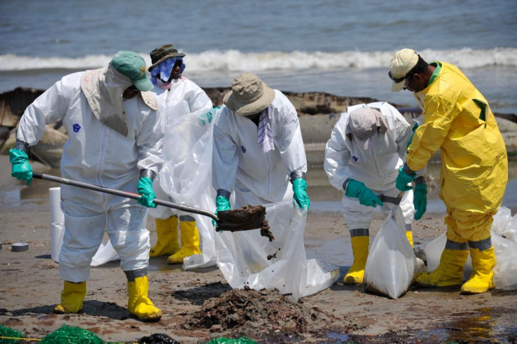 照片拍攝於2010年5月24日,在美國路易斯安那州南部的佛瓊港,清潔工人正在清理海灘上的油污。新華社記者張軍攝