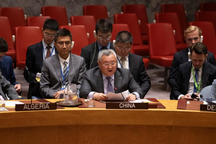6月24日,在位於紐約的聯合國總部,中國常駐聯合國代表傅聰(前中)在安理會伊朗核問題公開會上發言。新華社記者謝鍔攝