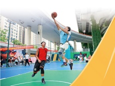 居民在改造後的成都雙橋子立交橋下籃球公園運動。劉雨傑攝