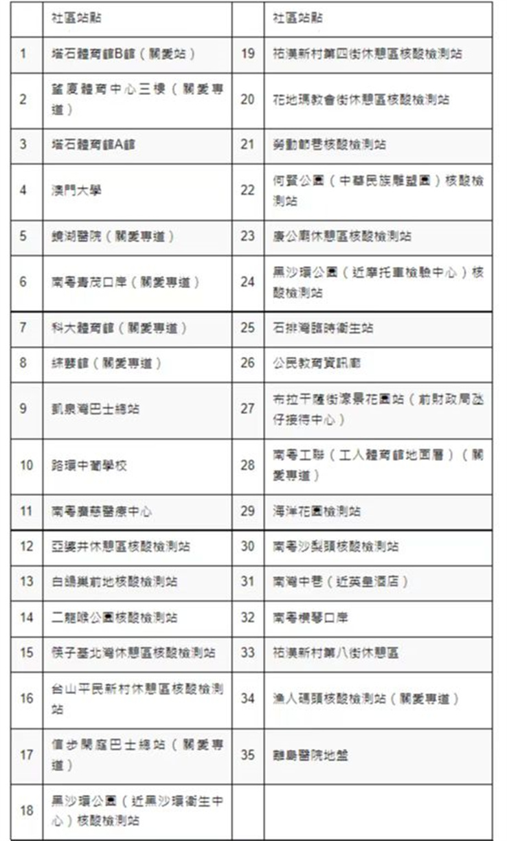 關愛站及設有關愛專道的派發點如下:塔石體育館B館為關愛站,其他設有關愛專道的站點包括:鏡湖醫院、望廈體育中心三樓、南粵青茂口岸、綜藝館、信步閑庭巴士總站、南粵工聯(工人體育館地面層)、漁人碼頭核酸檢測站、科大體育館;