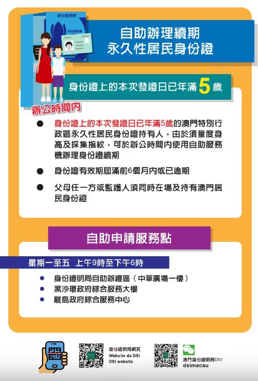 本網訊(記者 大林)身份證明局持續優化自助辦理永久性居民身份證續期的服務,自13日起,為方便未成年人辦理身份證,市民可於三個辦事處(南灣身份證明局、黑沙環政府綜合服務大樓或離島政府綜合服務中心)透過自助服務機為合資格的未成年子女辦理永久性居民身份證續期申請。