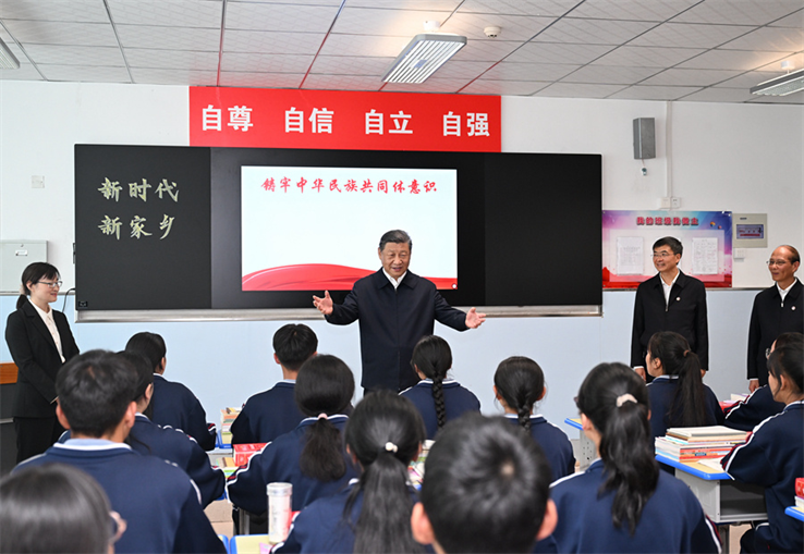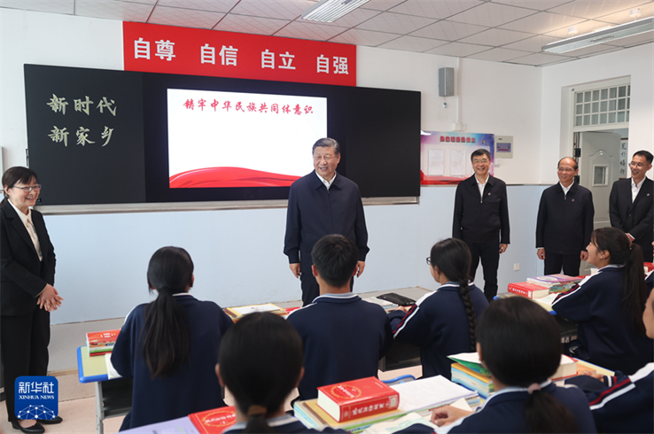 18日下午,習近平首先來到果洛西寧民族中學考察。這是一所隸屬於果洛藏族自治州的寄宿制中學,由上海市投資援建。習近平聽取上海等東部地區援助青海教育工作和學校建設情況介紹,詳細詢問學生構成、課程設置、體育鍛煉、普通話水準等情況,走進食堂、宿舍樓察看學生就餐和住宿條件,囑咐食堂工作人員一定要確保學生飲食安全、營養可口。之後,他來到高一(1)班教室,觀摩“新時代、新家鄉”主題思政課。瞭解到學校將思政課內容融入日常教學,聽了孩子們講述新時代家鄉的可喜變化,看了孩子們的畫作,習近平十分高興。他說,包括教育在內的東西部協作和對口支援取得顯著成效,充分彰顯了中國共產黨領導和中國特色社會主義制度的優勢,充分體現了中華民族大家庭的溫暖。要把鑄牢中華民族共同體意識作為學校思政課的一個重點,講好中國共產黨和中國特色社會主義的故事,講好新時代以中國式現代化全面推進強國建設、民族復興偉業的故事,講好中華民族共同體和民族團結進步的故事,把中華民族共同體意識從小就植入孩子們的心靈。