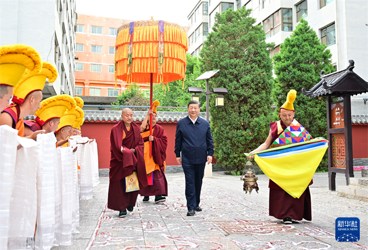 隨後,習近平來到位於西寧市城中區的宏覺寺。在寺前院落,宏覺寺民主管理委員會負責人向總書記敬獻哈達,僧人提香爐、持寶傘迎接總書記。習近平參觀青海省民族團結進步教育基地展陳等,瞭解寺廟歷史沿革、老一輩革命家關心推動民族工作和宗教工作的情況。他走進大殿,聽取寺廟加強日常管理、促進民族團結進步等情況介紹。習近平指出,宏覺寺這座千年古刹,在增進歷代中央政府與藏傳佛教聯繫方面發揮了重要的橋樑紐帶作用。要保護好這份珍貴的歷史文化遺產,為鑄牢中華民族共同體意識、促進民族團結進步作出新貢獻。要向老一輩革命家學習,把新時代黨的統戰工作、民族工作、宗教工作做得更好。習近平強調,以中國式現代化全面推進強國建設、民族復興偉業,需要全國各族人民包括廣大信教群眾團結奮鬥。希望青海藏傳佛教界弘揚愛國愛教優良傳統,促進宗教和順、社會和諧、民族和睦,在中國式現代化進程中發揮積極作用。