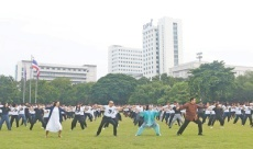 泰國海上絲路孔子學院學生在泰國博仁大學球場表演太極拳。張楚雄攝