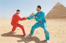 太極拳愛好者在埃及吉薩省金字塔前交流太極拳技術與動作。欣德·法蒂·穆罕默德攝