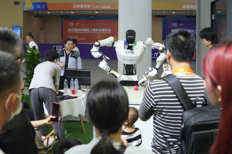 5月15日,觀眾在第四屆長沙國際工程機械展覽會現場觀看人形機器人演示。新華社記者 薛宇舸 攝
