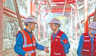 周坤朋(左一)在施工現場與技術人員交流。侯雲鵬 攝(人民視覺)
