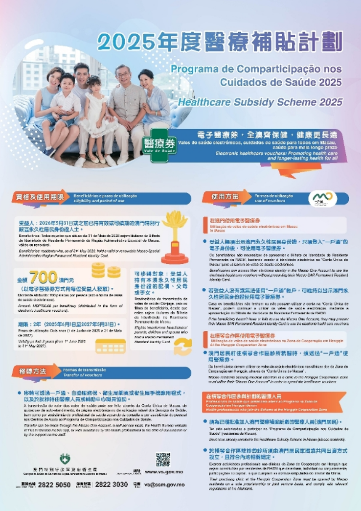 此外,為配合《橫琴粵澳深度合作區建設總體方案》,《2025年度醫療補貼計畫》 適用範圍繼續擴展至橫琴粵澳深度合作區,澳門居民於合作區內參與計畫的診所就診時須透過“一戶通”使用醫療券;為落實資源下沉,進一步發揮社區醫療資源優勢,強化醫療券功能,稍後亦將配套推出“慢性病篩查計畫”,屆時居民可使用醫療券在參與該計畫的診所進行慢性病篩查,從而提高及早發現和預防慢性病的意識,以促進主動健康管理,提升醫療補貼計畫效能。