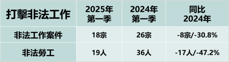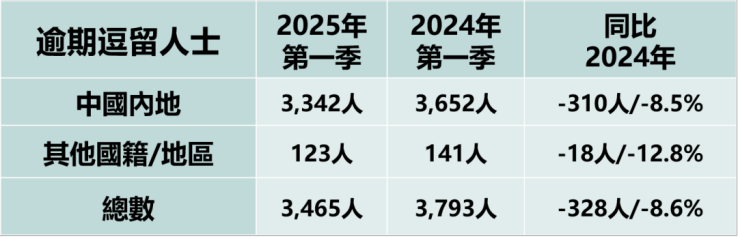 今年第一季逾期逗留人士有3,465人,較2024年同期減少328人,下降百分之8.6。