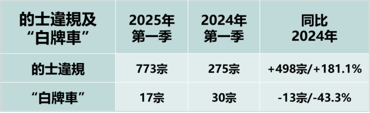 交通執法方面,治安警察局聯同交通事務局於今年第一季合共檢控的士違規個案773宗(其中治安警察局檢控個案共660宗),其中超過半數為“的士站無按序候客”的情況。警方已對違規個案依法作出處理,並勸導違規司機。